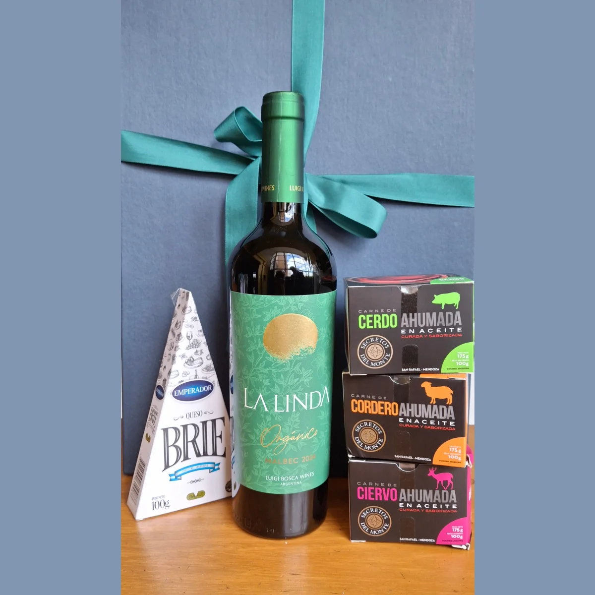 Caja de regalo gourmet que combina una botella de vino Luigi Bosca La Linda (Malbec, Red Blend o Sweet Viognier) de 750 ml con una selección premium de productos gastronómicos: tres latas de carnes feteadas en aceite – ciervo ahumado en frío, cordero ahumado en frío y cerdo ahumado en frío – acompañadas de queso brie (100 g).