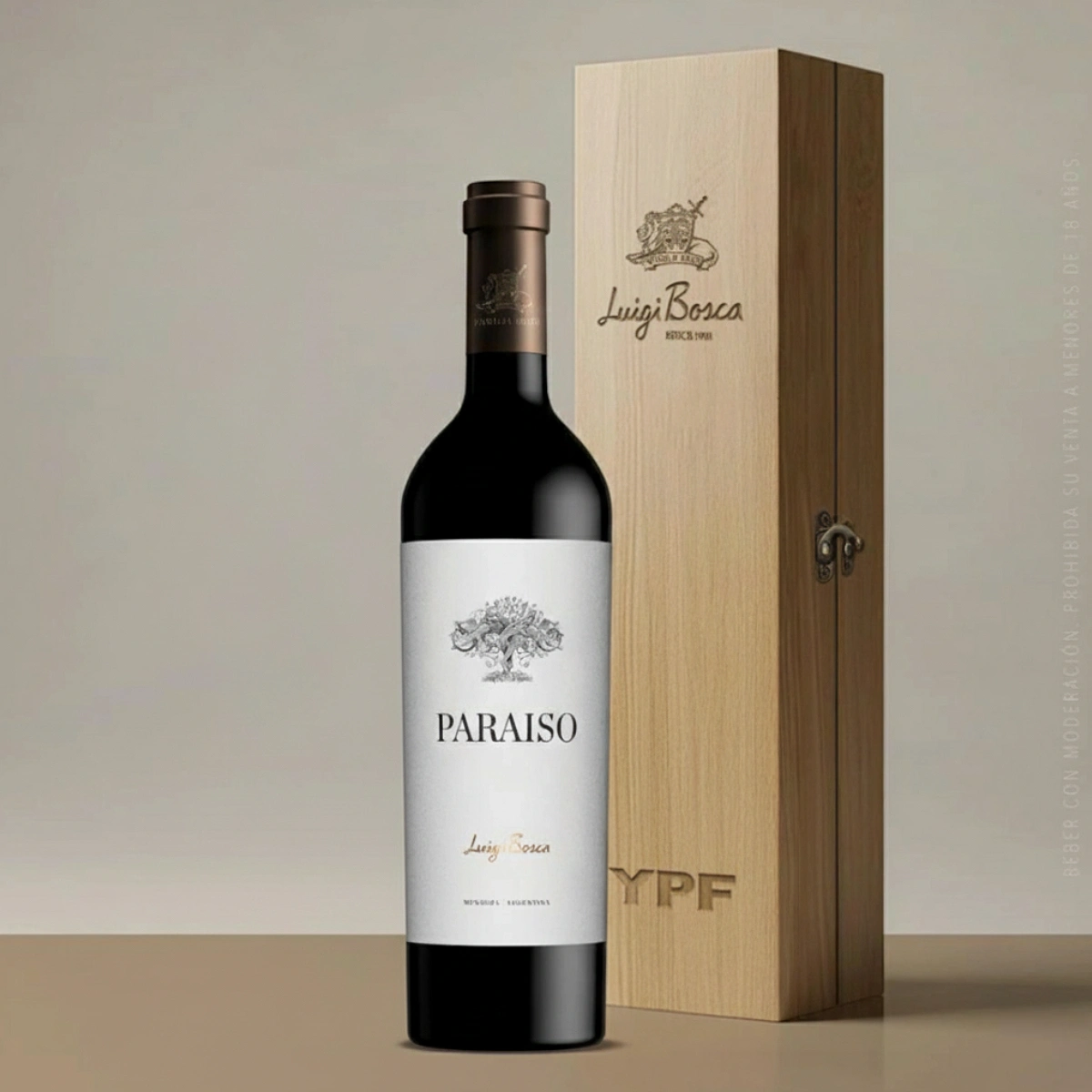 Caja de regalo premium que presenta una botella de vino Paraíso de Luigi Bosca, reconocido por su elegancia y carácter distintivo.