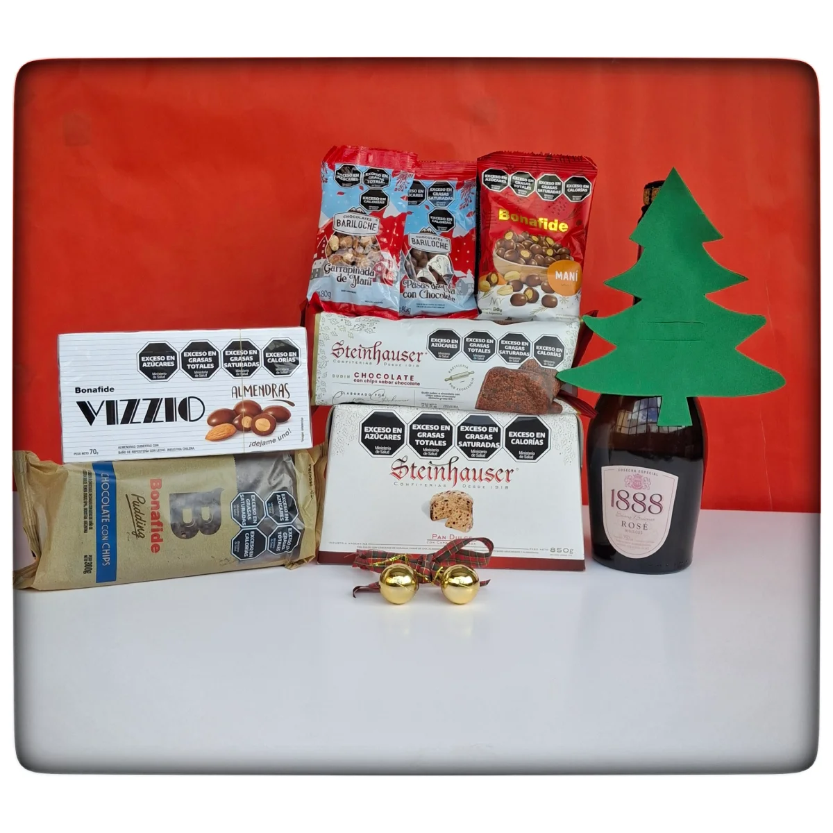 Este box combina sidra 1888 Cosecha Especial con una selección ampliada de productos dulces y chocolatería fina — pan dulce, budines y frutos secos bañados — que realzan el espíritu navideño.